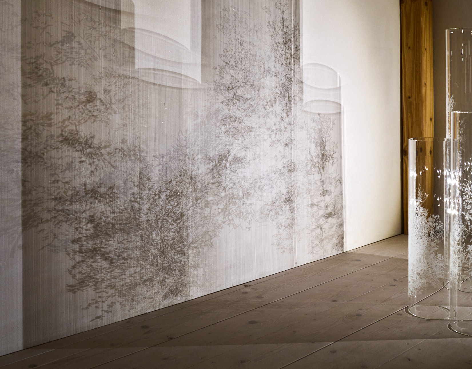 The wooden construction holds nine geometric sheets of sandblasted glass, which, together, form a spatial, translucent screen. On this screen the image of trees is projected. The image is of trees obscured by slowly moving milky fog - drops of water springing from a nearby source and blown by the wind. The material part of the installation constitutes a static repetition of recovered and registered visual structure.