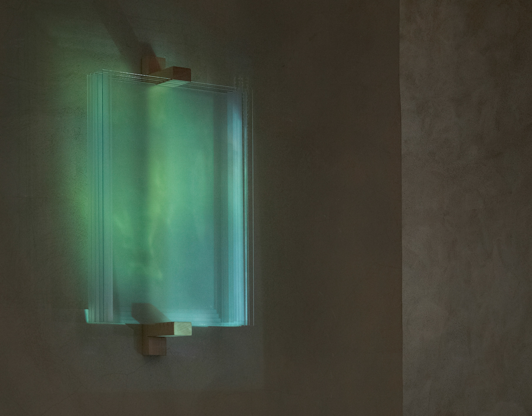 Leaning on edge against the wall is the glass cast of a rumpled bed sheet, which bears the traces of the night in its folds and formations. Where a human being left impressions through his movement, the viscous hot glass has found the folds (French: pli) through a plaster mold in the melting furnace and taken them over during cooling. In the process of movement and standstill, the glass becomes a memory of time. Judith Röder couples this „memory surface“ to a video projection that takes up movement, standstill and change. Brightly colored contrasts in light and dark nuances reflect on the folds and curvatures of the glass until the glistening light refracts in the glass and the movements of a sleeping person become recognizable in shadowy images. Glass and video alternately transform the present and the absent into an illusion of light.