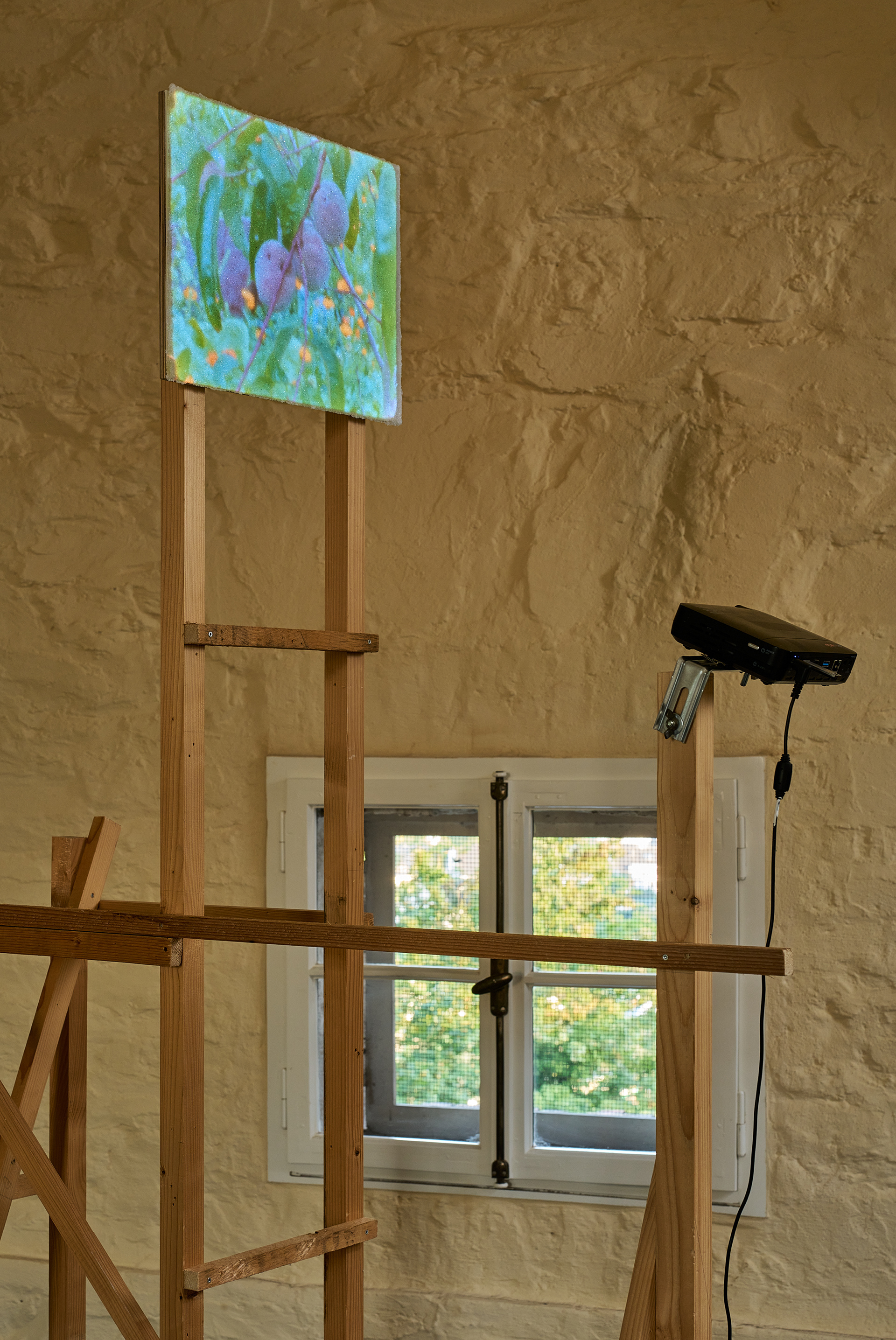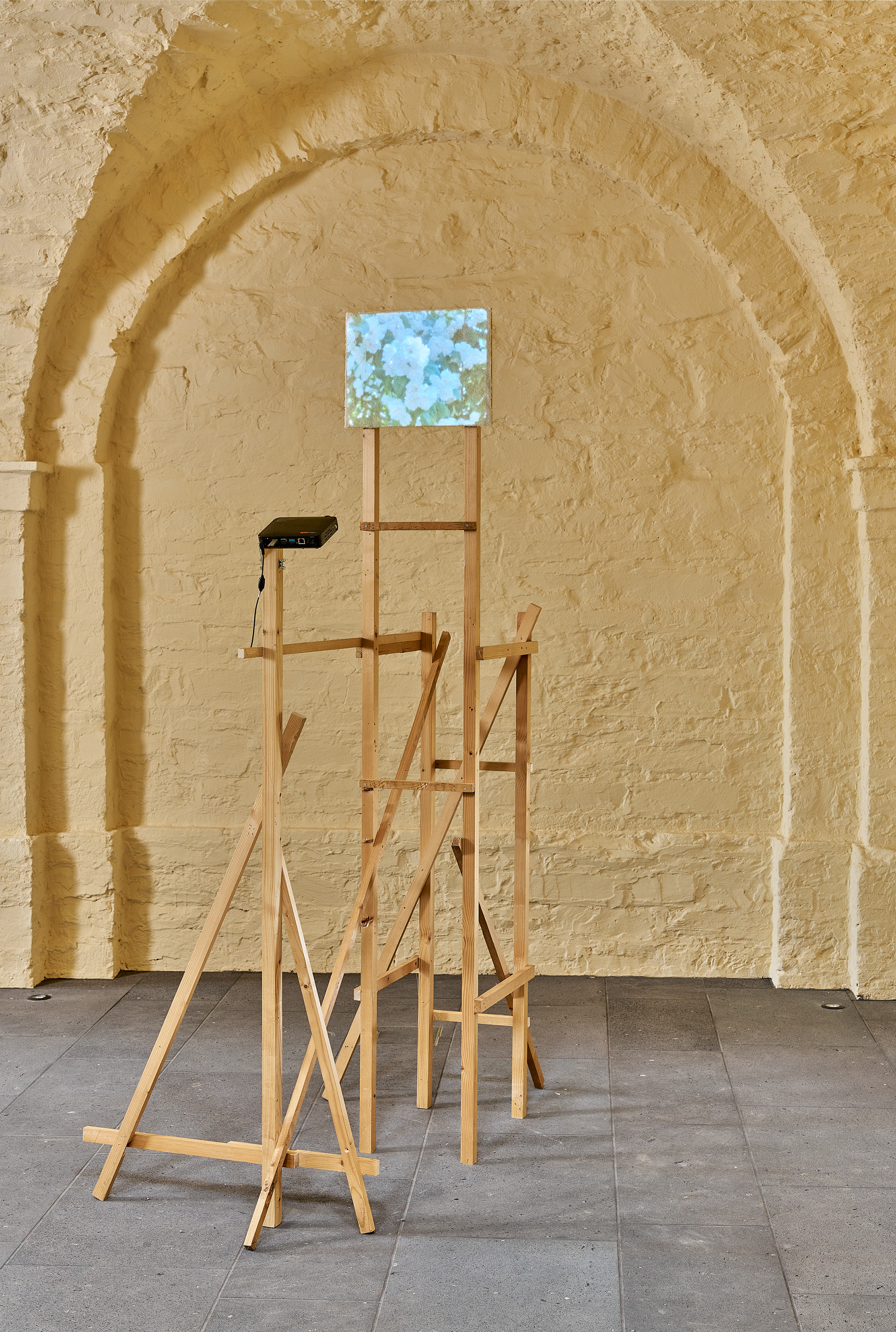 wood, video projection (16mm transferred to HD-video, 16 min- loop, 4:3, colour, silent), pâte-de-verre glass screen