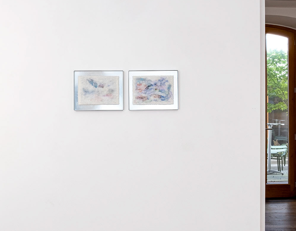 The installation of overhead projectors and glass panes seems like a meditation on light. It emerges from the interplay of glass and light and creates colorful, structured pictorial spaces. Through the projection of found forms from discarded glass panes, a composition of different material structures emerges on the wall and evokes a reminiscence of modernism.