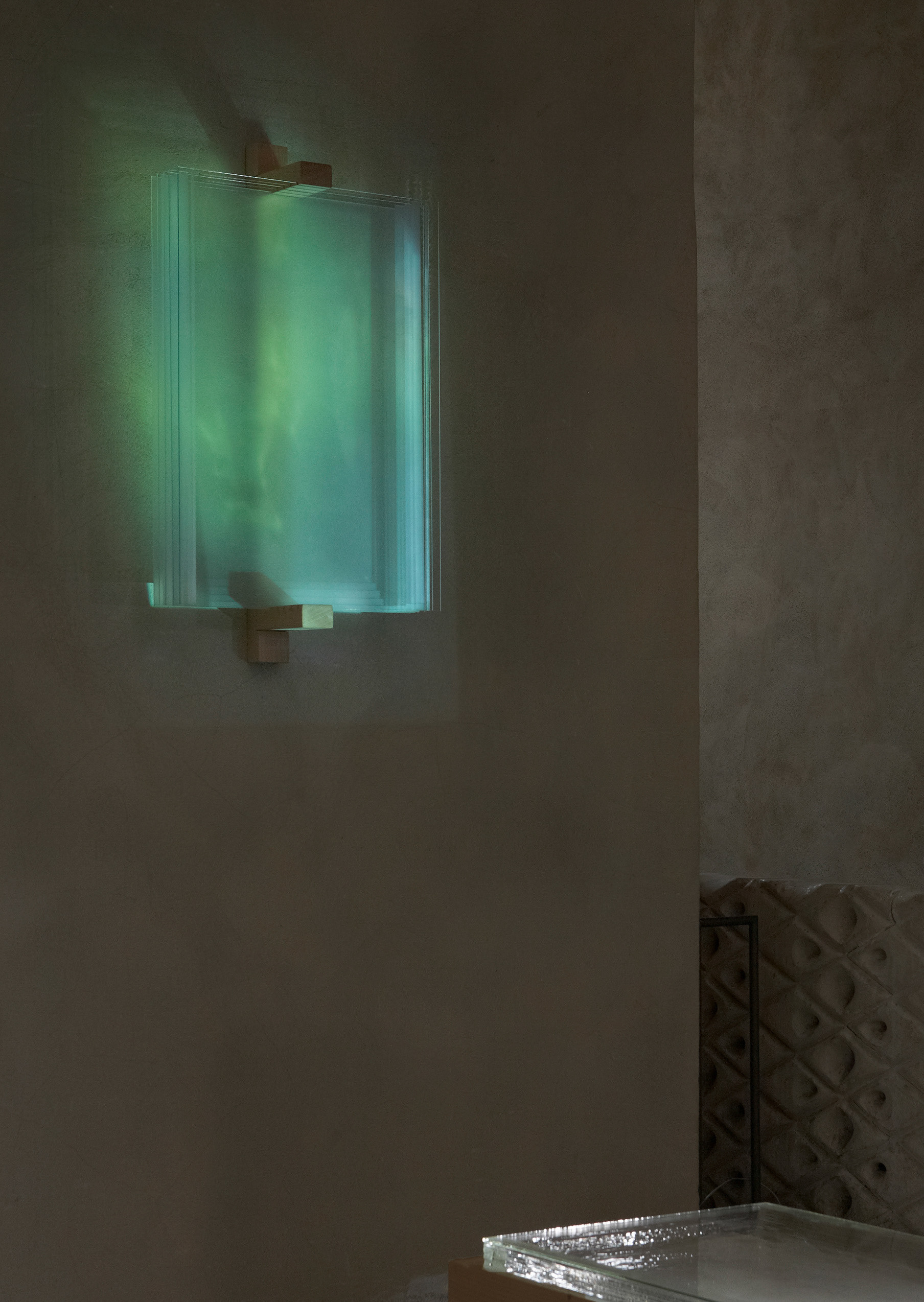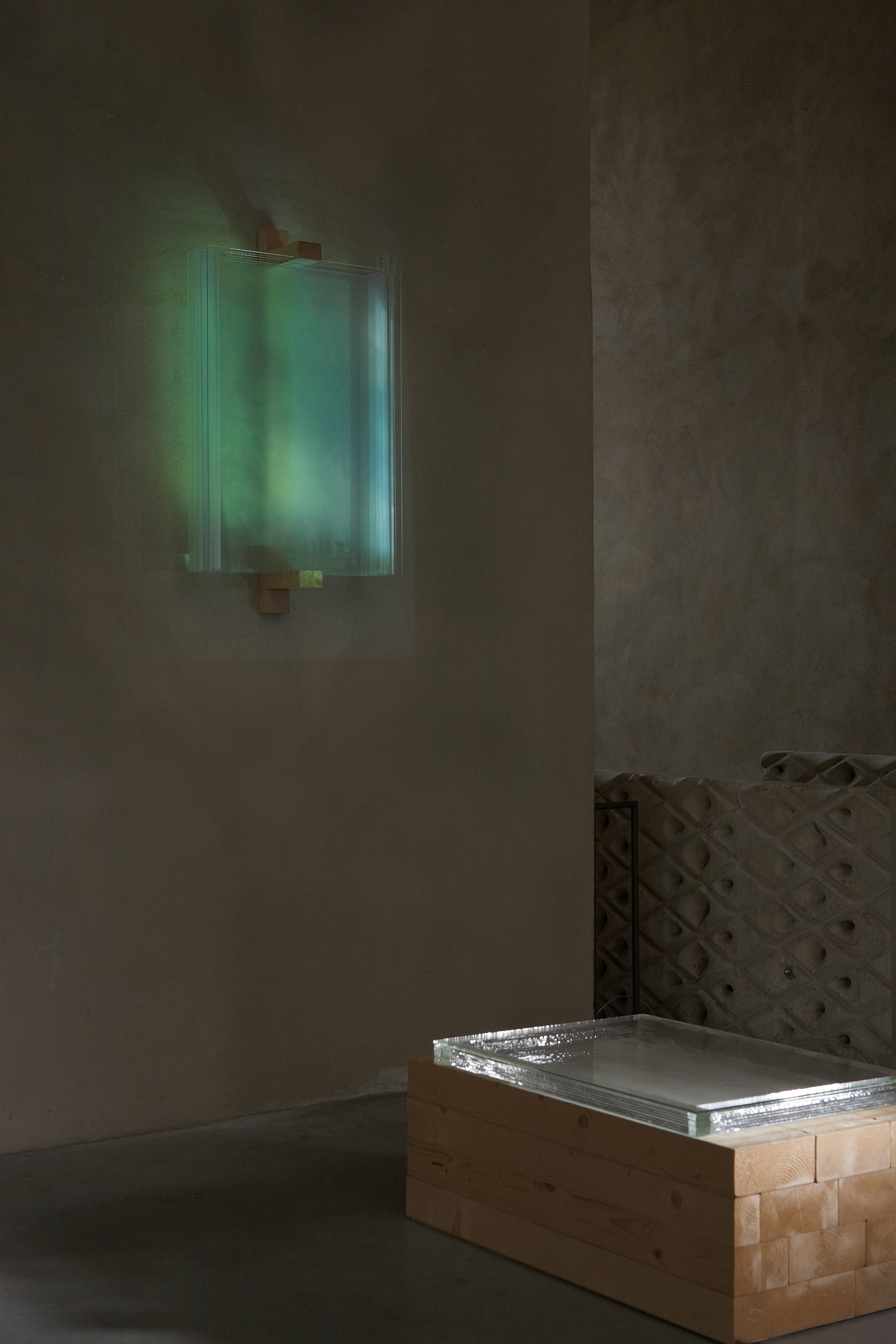 glass, wood, video projection