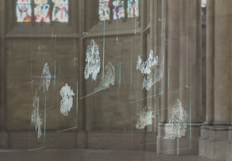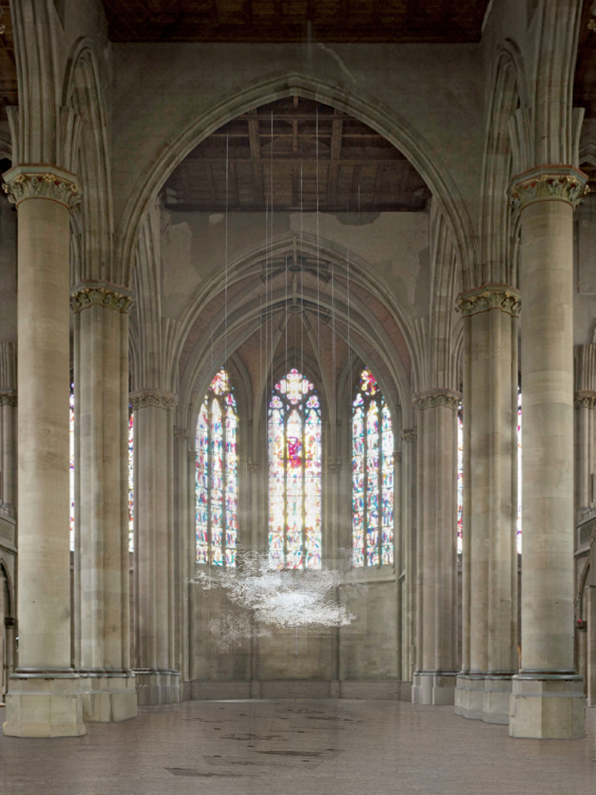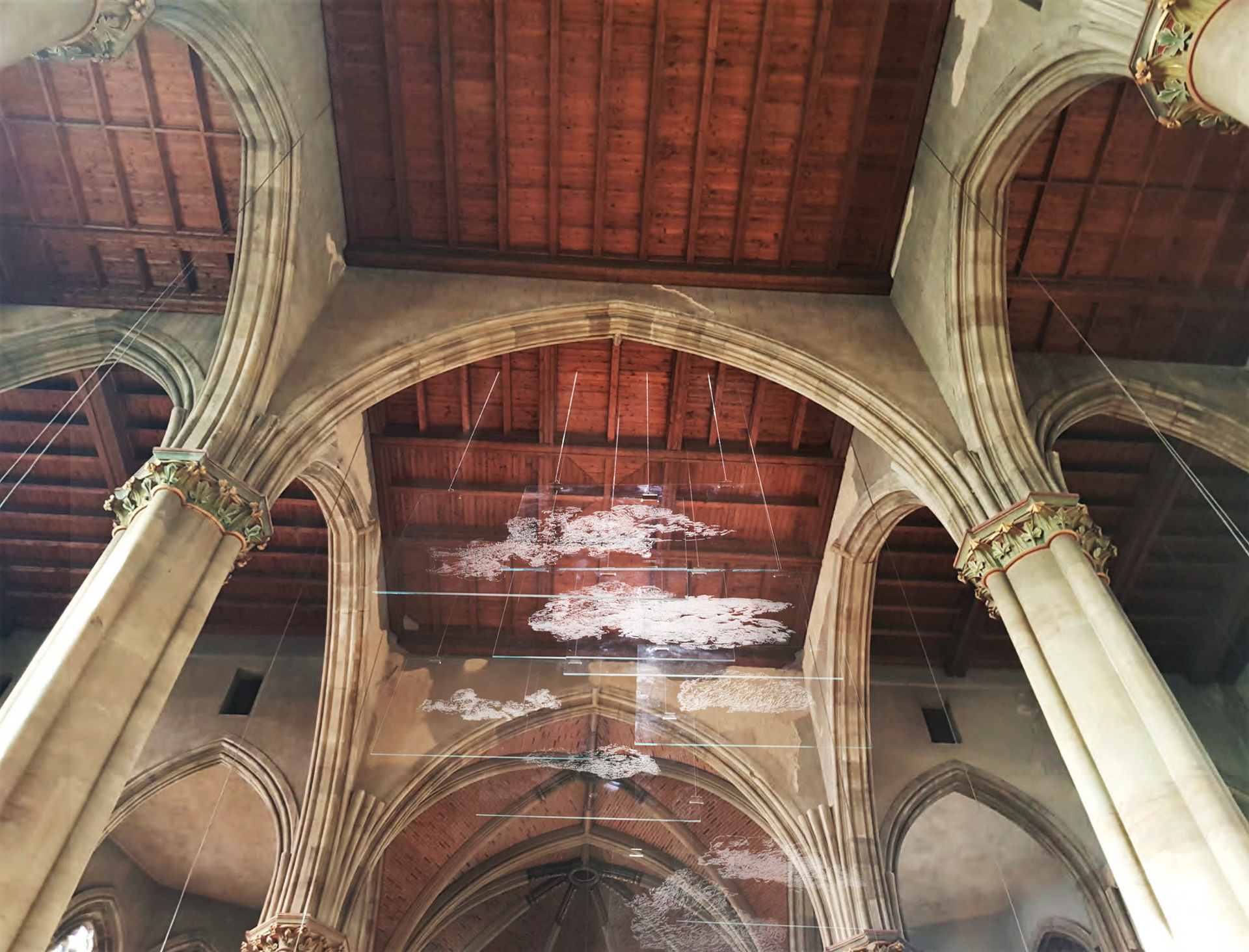 Eine fragile, schwebende Installation aus transparentem Glas mit eingravierten Wolkenzeichnungen greift die architektonische Struktur der neugotischen Kirche auf und lädt Besucherinnen und Besucher ein, diese aus verschiedenen Standpunkten und Perspektiven zu erkunden. Die Schattenprojektion auf dem Fußboden ist begehbar bzw. körperlich subtil erfassbar.
